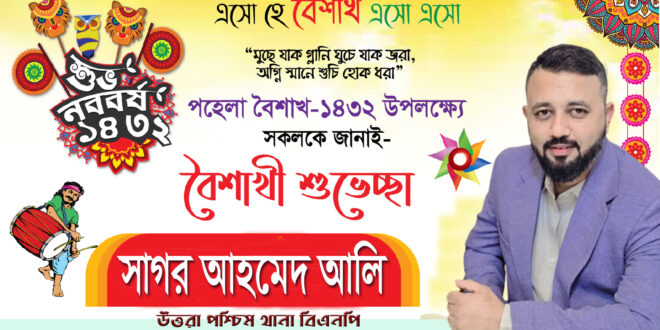 তিনি আরো বলেন আমি সাগর আহমেদ আলী ‘১৪৩২ বাংলা সনের প্রথম দিনের নতুন আলোতে মহান আল্লাহ রাব্বুল আলামীনের কাছে কায়মনোবাক্যে উত্তরাবাসী ও দেশের সব মানুষের সুখ ও শান্তির জন্য প্রার্থনা করছি। নববর্ষের এই নতুন সকালে মহান আল্লাহর কাছে সবার ব্যক্তিগত ও পারিবারিক তথা জাতীয় সকল পর্যায়ে সুখ ও শান্তি কামনা করি।’